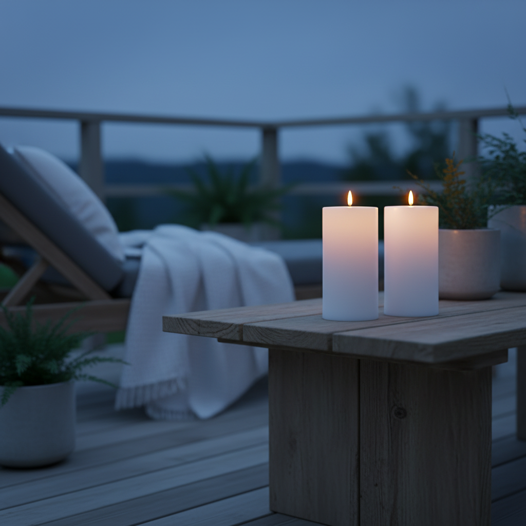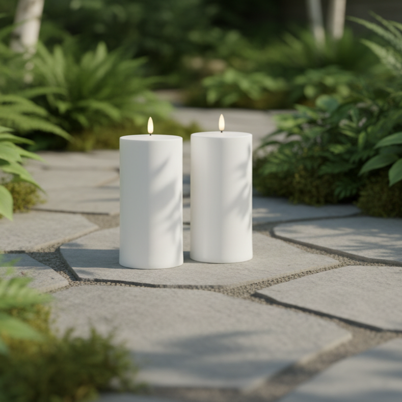 Schaffen Sie eine gemütliche und stimmungsvolle Atmosphäre auf der Terrasse oder im Garten mit diesen schönen LED-Stumpenkerzen für den Außenbereich. Die naturgetreuen Flammen verbreiten ein warmes und einladendes Licht – perfekt für lange Sommerabende, romantische Abendessen unter freiem Himmel oder als stimmungsvolle Begrüßung am Gartenweg.