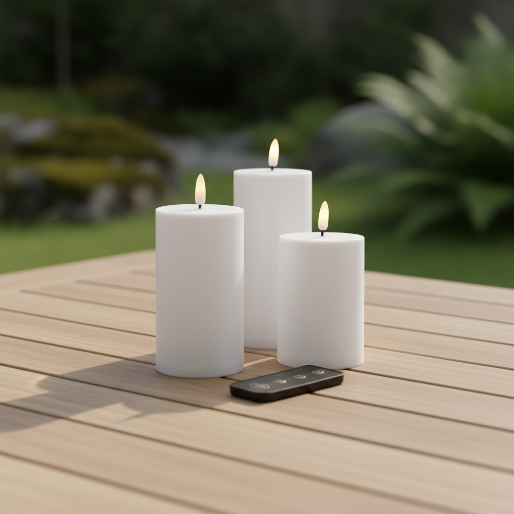 Elegante set met drie witte LED -kaarsen, ideaal voor buitenruimte. Perfect voor kleine lantaarns, de tuintafel of een gezellige buitensfeer.