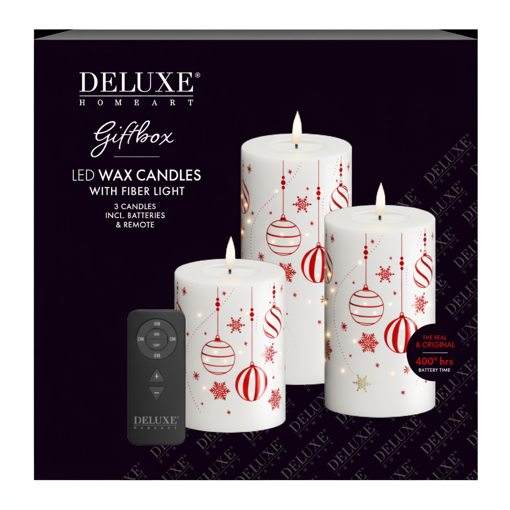 Schaffen Sie eine magische und festliche Atmosphäre mit diesem exklusiven Geschenkset von Deluxe Homeart. Das Set enthält drei LED-Stumpenkerzen in unterschiedlichen Höhen, verziert mit dekorativen roten Weihnachtsmotiven, die in Wohnräumen, auf der Fensterbank oder als Tischdekoration eine warme und stilvolle Wirkung entfalten. Die realistische 3D-Flamme und die dezenten, nach unten leuchtenden Dioden erzeugen einen besonders lebensechten Kerzeneffekt – ganz ohne offene Flamme, Rauch oder Ruß.