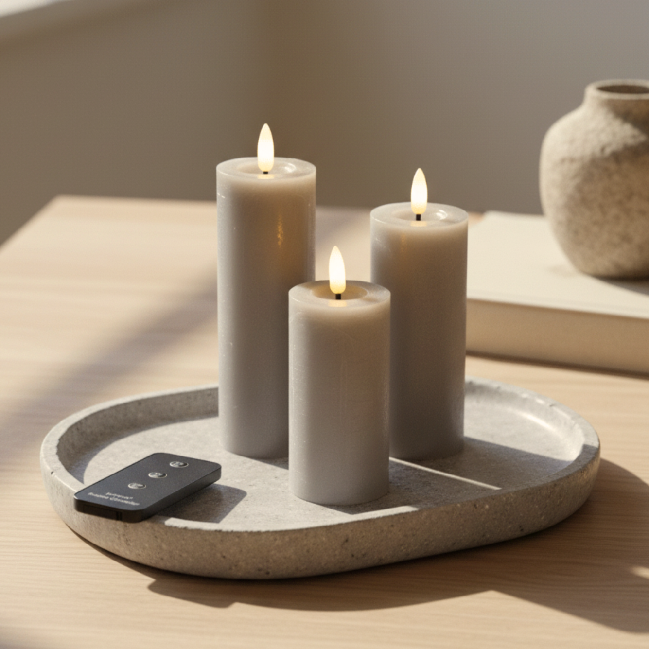 Sandfarbenes LED-Stumpenkerzen-Set mit 3 Kerzen und Fernbedienung