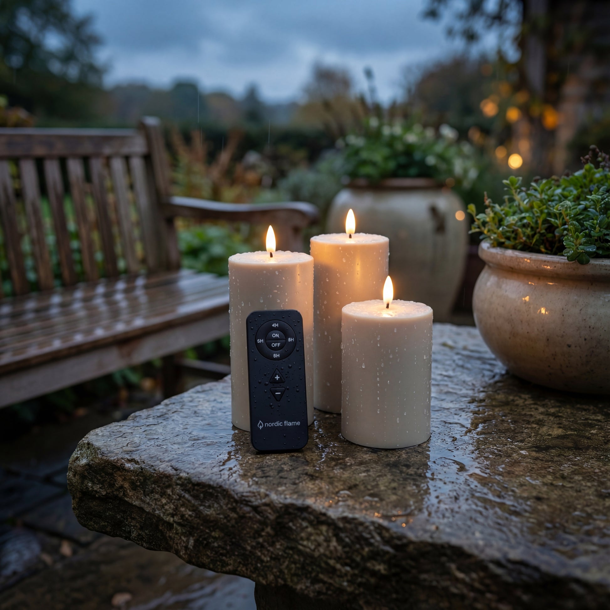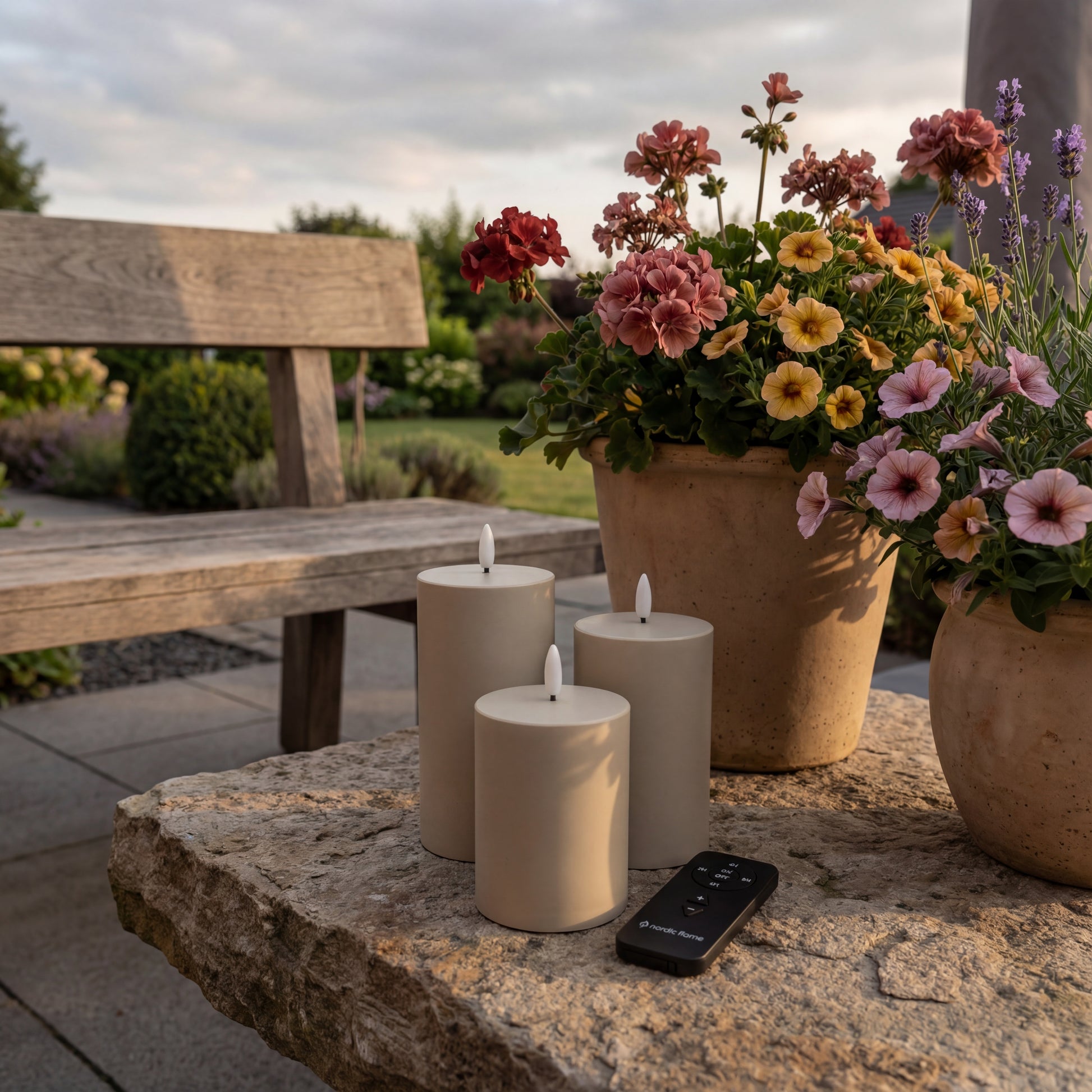 Outdoor Premium LED-Kerzen – Nordic Flame 3er-Set mit Fernbedienung